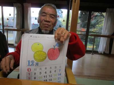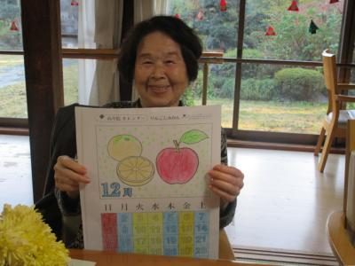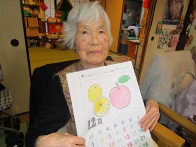 リンゴとみかんが描かれた暦を選ばれたお母さん・・・・