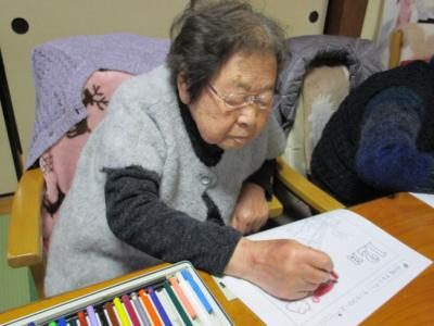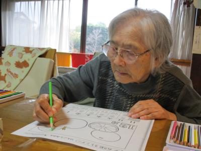 そおぉ?? 照れながら塗り絵を眺めるお母さん。