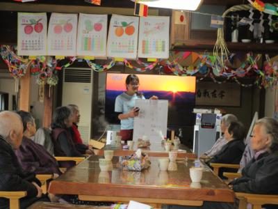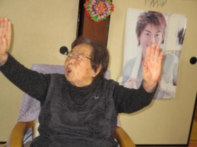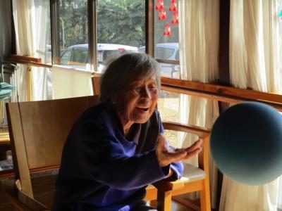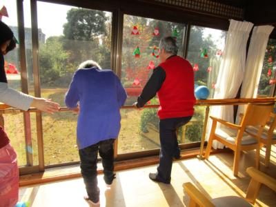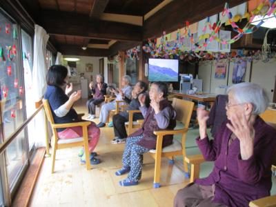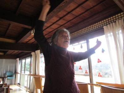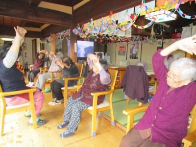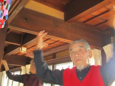 縁側では、クミチャン指導の下 元気に身体を動かす皆さんの姿・・・