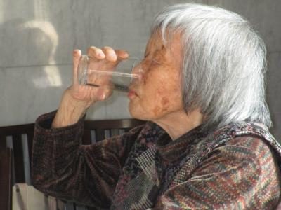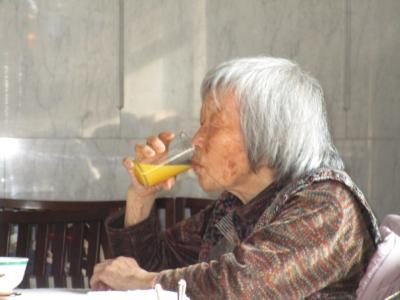 フレッシュジュースのあまりの美味しさに、喉を鳴らして飲み干すお母さん