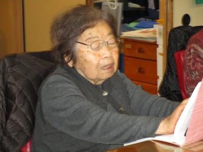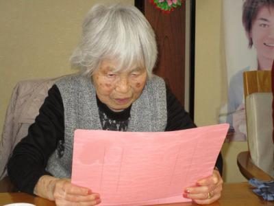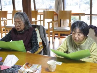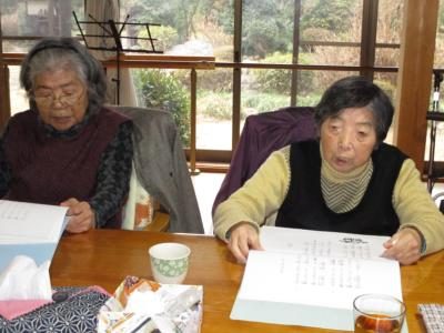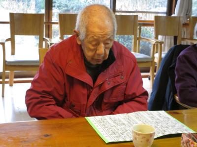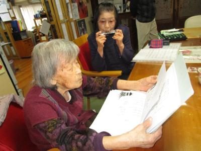 歌詞を目で追いながらハーモニカの演奏に合わせ