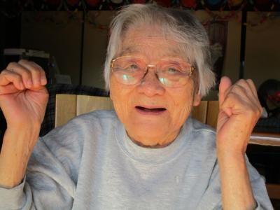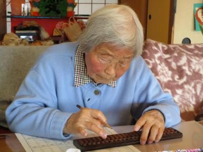 みとり算では、そろばんを使って真剣な表情で取り組む母・・・