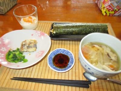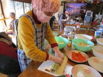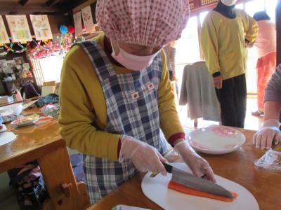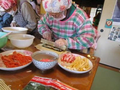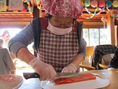 メインの恵方巻きは玉子やサーモン等を均等にカット