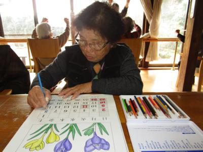 季節の暦の色塗りに没頭する母達は、きれいなクロッカスの絵を丁寧に色塗りされています。