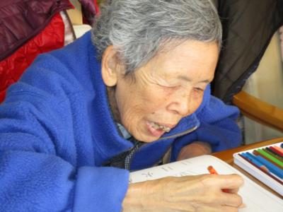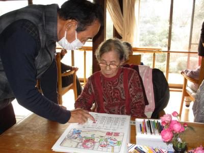 スタッフに途中段階の塗り絵を披露のお母さん。
