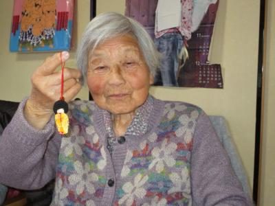 本日 可愛らしいちりめん根付けが完成した母の作品です\(^o^)/