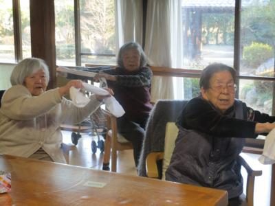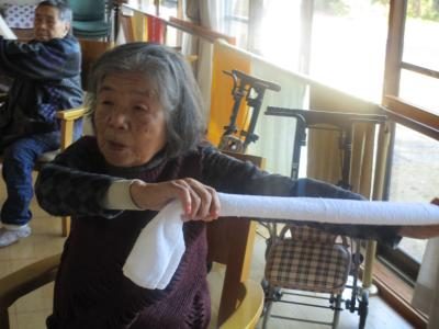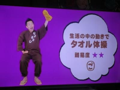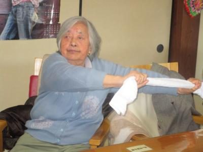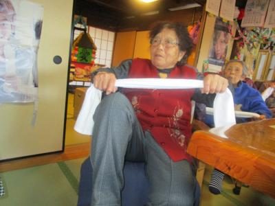 庵に戻りごぼう先生と一緒にタオル体操で身体を動かしました走る人