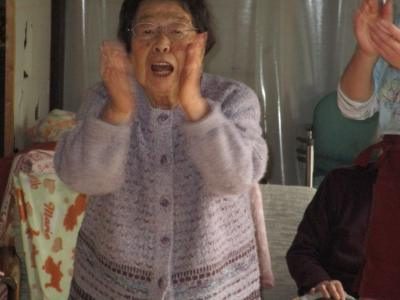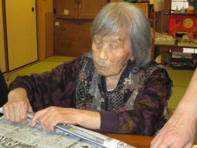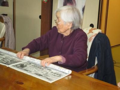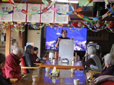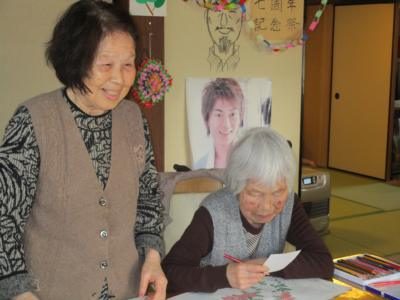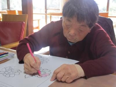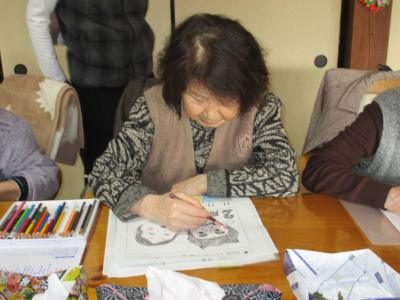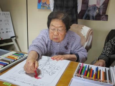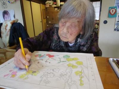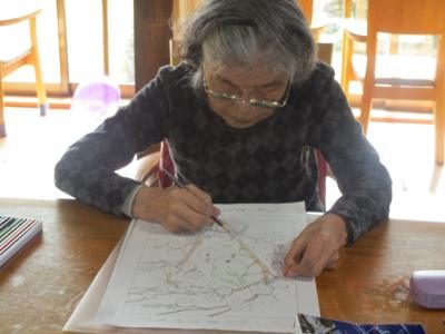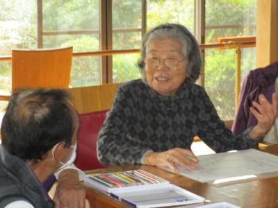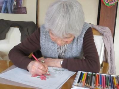 塗り絵の手を止め、昔話に花を咲かせる母・・・