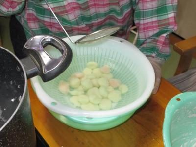 浮き上がってきたら冷水にあげて冷やします。