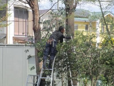 本日も、庭師の方々が一生懸命に剪定作業をして下さっています。