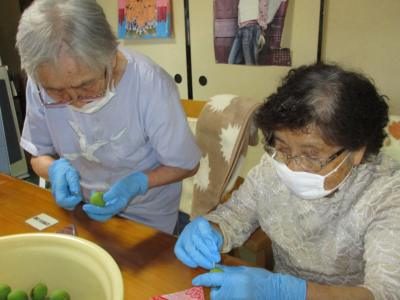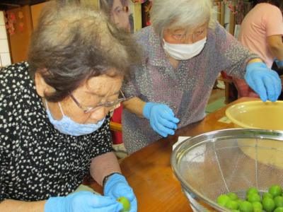 アク抜きした青梅のヘタ取りをします。