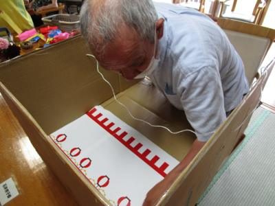 射的台を作る父はサイズを確認し、印を付け貼る位置を決め、