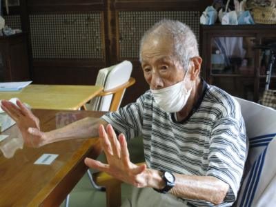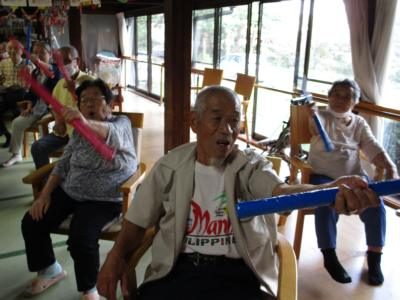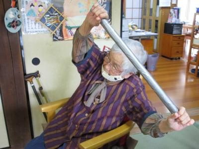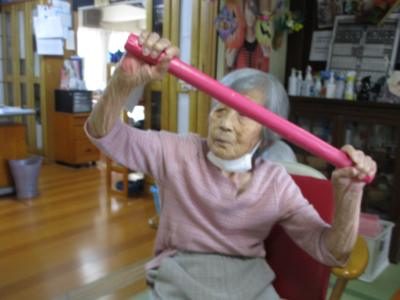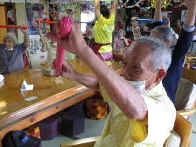 お手製の棒で手を上げたり、身体をひねったり、手首を