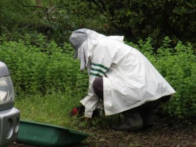 庭先では小雨の降る中、朝早くから金子さんが草取りを