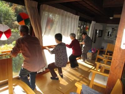 身体を動かす事が大好きな母達は、広い縁側へと移動され流れるメロディに合わせて楽しく体操に取り組まれています。