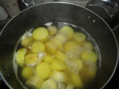 サツマイモをラップの上に乗せ、茶巾絞りにします。