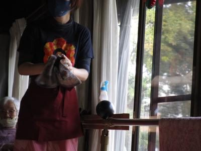 しっかり窓を開けて換気を行なっていますので、マスクは