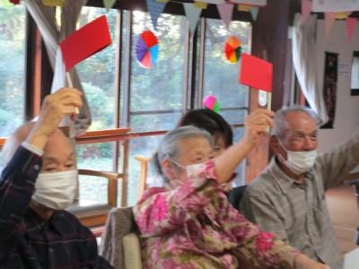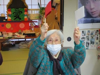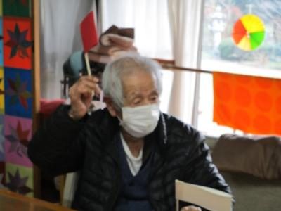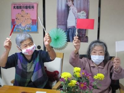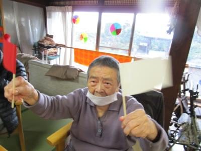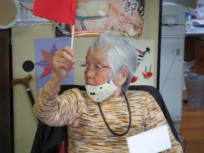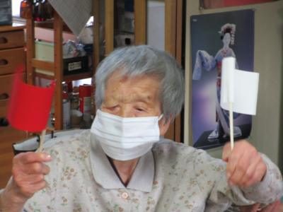 今日はかみちゃんの手作りの紅白の旗を手に旗揚げゲーム