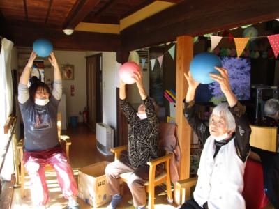 くみちゃん指導の下、手作り棒やボールを使い上・下肢