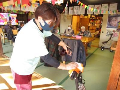 利用者様が手に降れるであろう部分は、小まめに消毒を行っております。