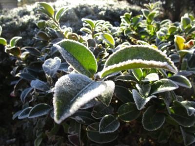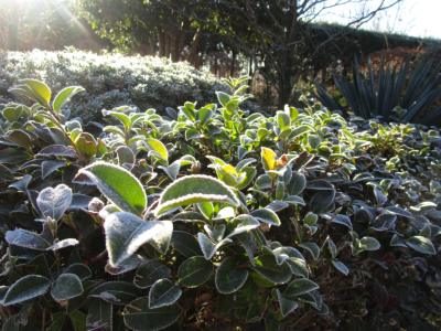 葉っぱに霜が降り白くなっている所に日が当たり、