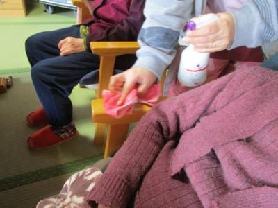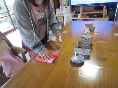 テーブルや手すり等は昼食前・お昼休み・おやつ前・皆さんが帰った後に、