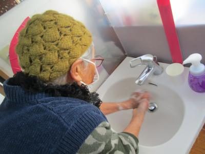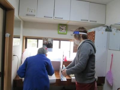 洗面所で手洗い指導に当たっているスタッフは、飛沫感染予防としてマスク✙フェイスガードでしっかりと予防しています。
