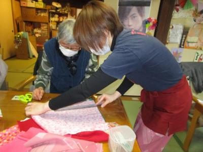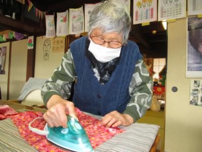 器用な手付きでちりめん生地にアイロンをかけ、裁断も手伝って下さいました。