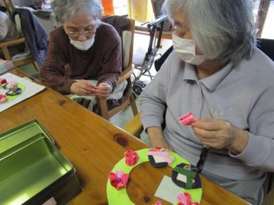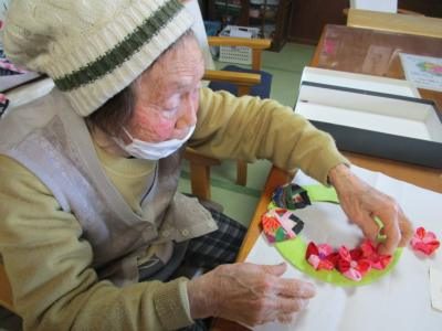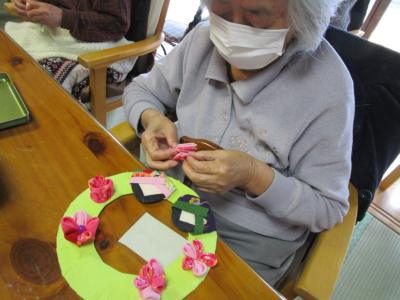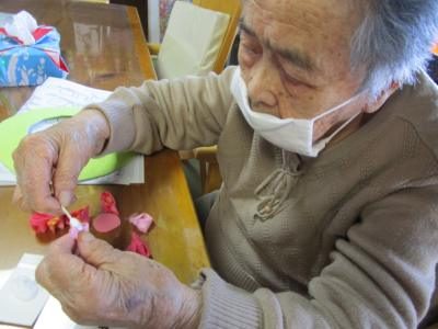 お内裏様・お雛様と桃の花をちりめんで作り上げていきます