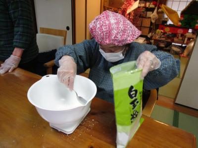 めん棒で白玉粉を細かくしていきますー (長音記号2)ー (長音記号2)ー (長音記号2)
