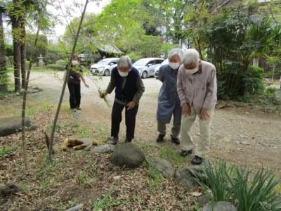 朝のセレモニーの後には、お庭に出てタケノコ堀体験を行いました。