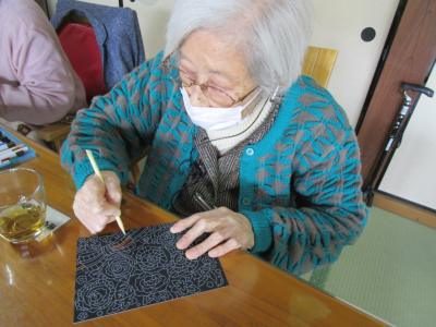 朝の脳トレの時間を使い、それぞれにお好きな柄を選び竹くしで削っていき色をだしていきます