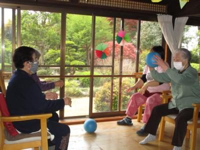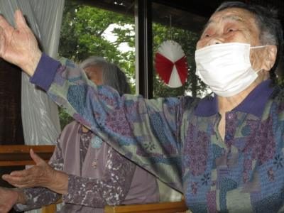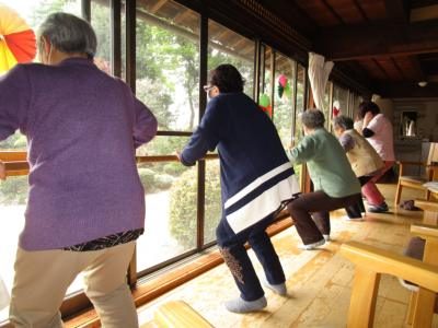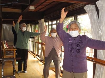 歌謡体操では、流れるメロディに合わせて身体を動かす父や母。。。