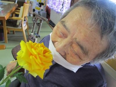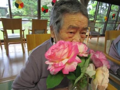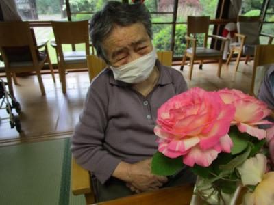 目を細めながら、可愛らしいバラの花を愛でる母ぴかぴか (新しい)