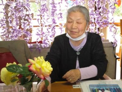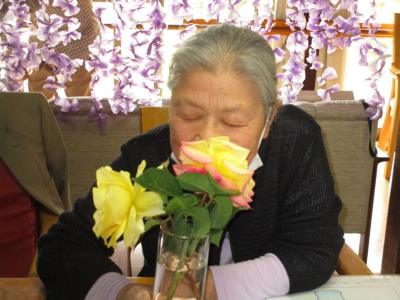テーブルの上の薔薇の香りを嗅ぎながら、