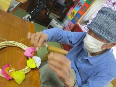リースにご自身で造られた花を一つ一つさしていきますが、最後のつぼみがなかなか上手くささらず、悪戦苦闘