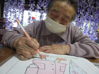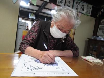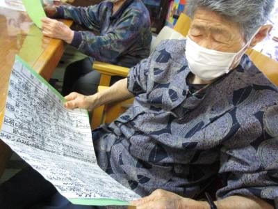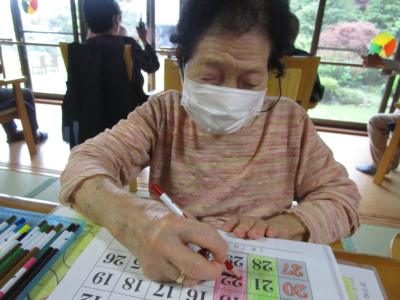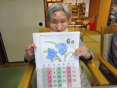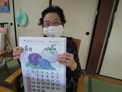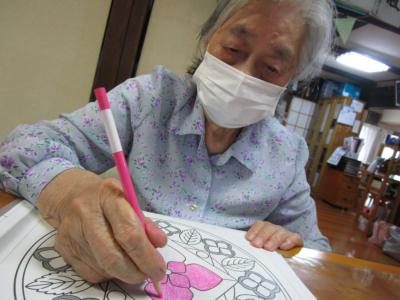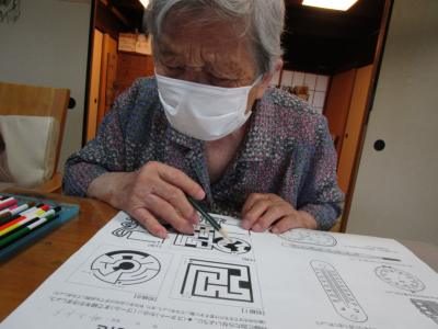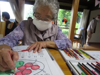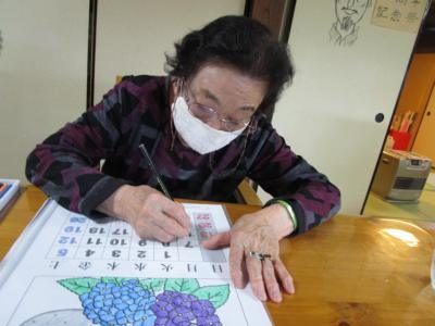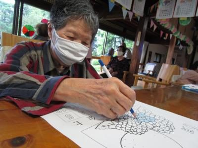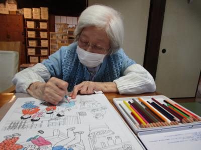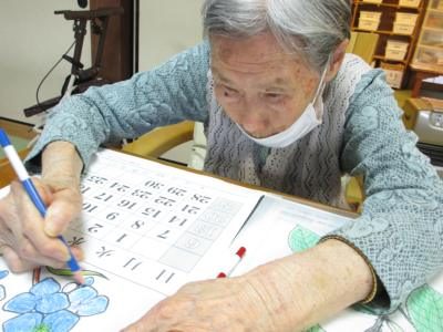 脳トレのお時間に、暦塗り絵や計算問題、漢字やことわざに挑戦する眼差しは本当に真剣なんですよ