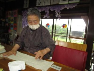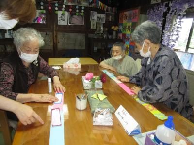 願い事を書かれた後は、吹き流しに貼っていく作業です。