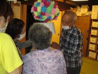 薬玉に輪飾りを吊るし、皆さんが書いた願い事を吊り下げていきます。