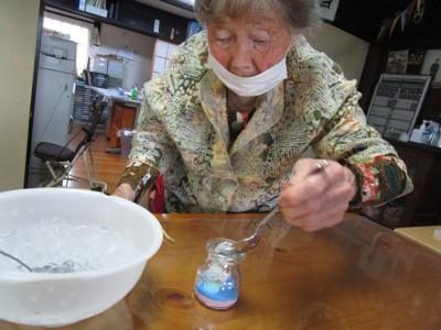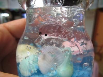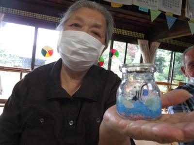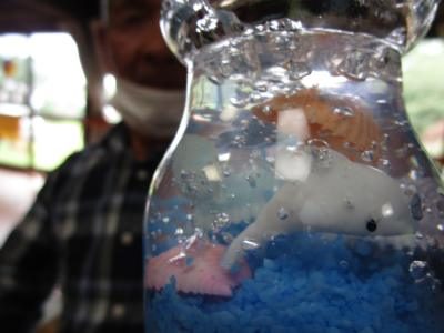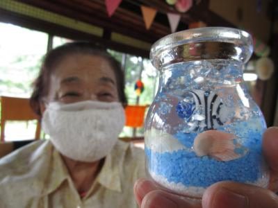 貝殻や夏のモチーフを割り箸を使って、上手に瓶の壁側に持っていきます