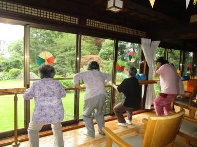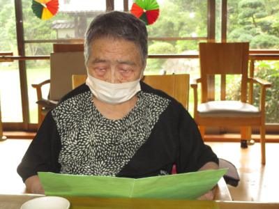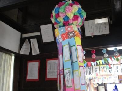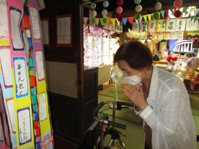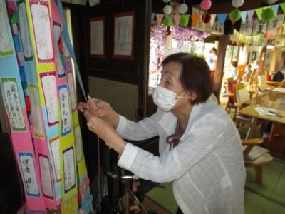 本日ご利用の母にも短冊に願い事を書き入れて頂き、早速七夕飾りの吹き流しに吊り下げました。