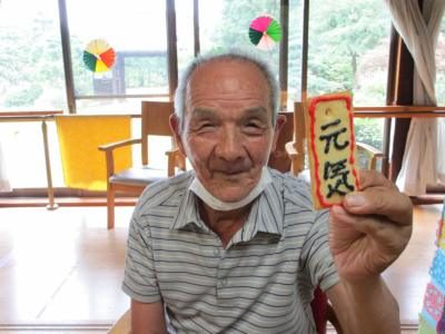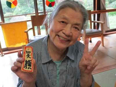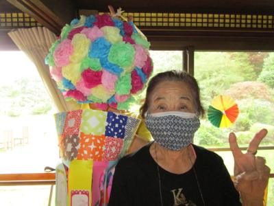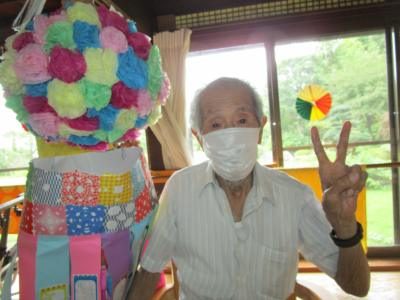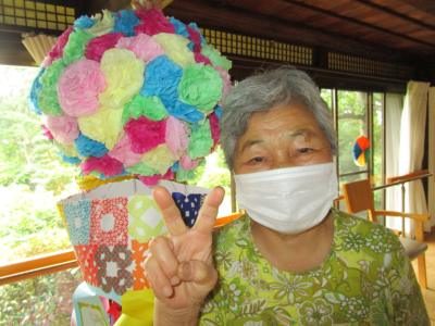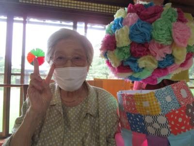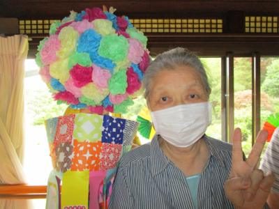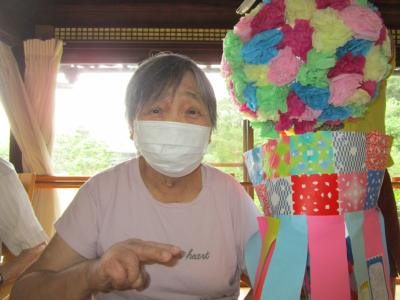 皆さんで製作した七夕吹き流しの前でハイ・ポーズ