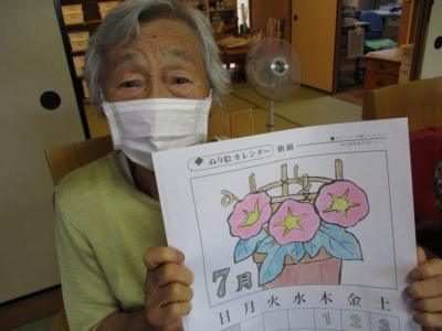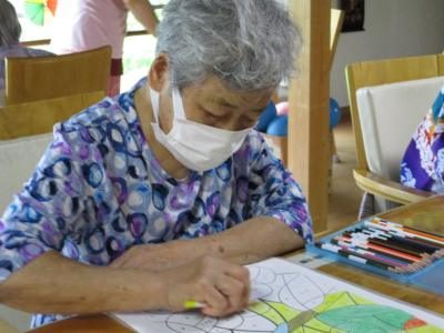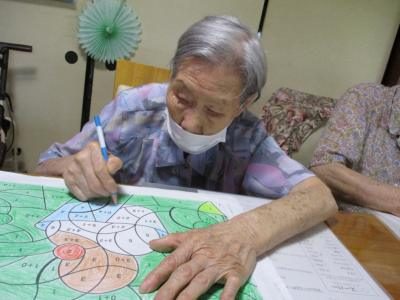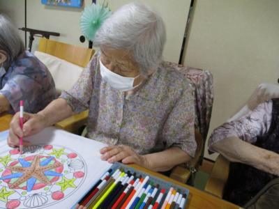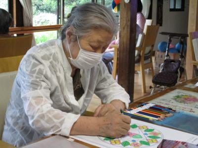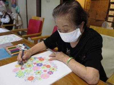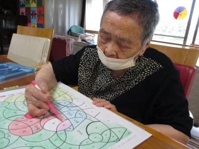 午前は数字塗り絵や曼陀羅塗り絵で脳の活性化