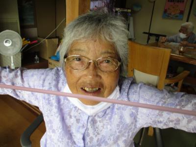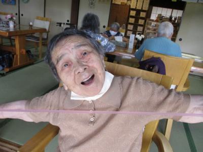 「びよ~~~ん!!」と機能訓練中にゴムチューブを使い
