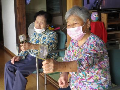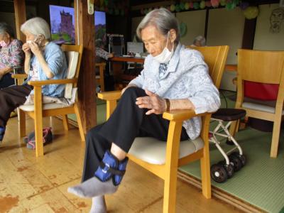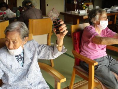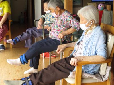 機能訓練ではハンドグリップや重錘を使い上下肢の筋力アップ