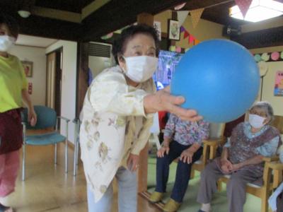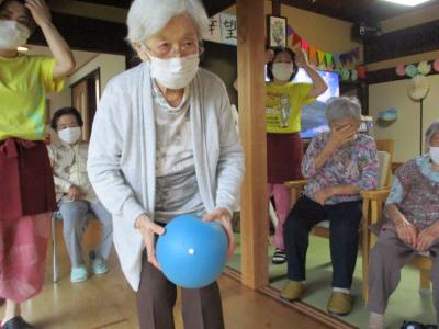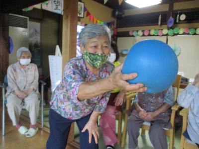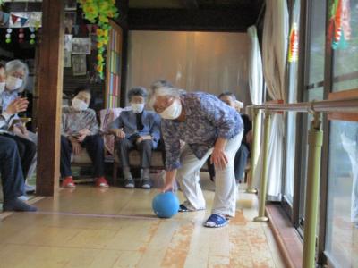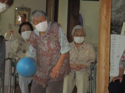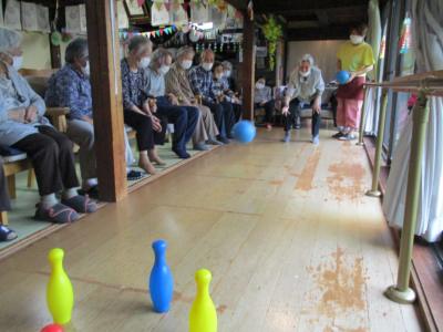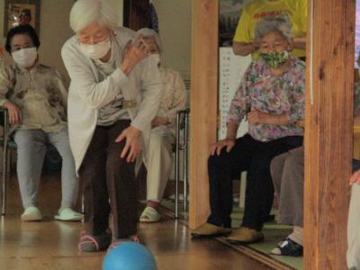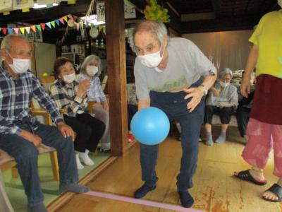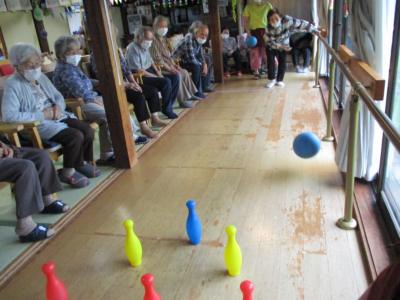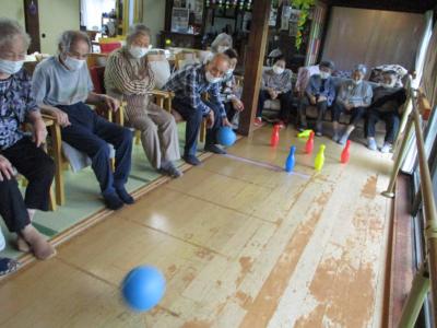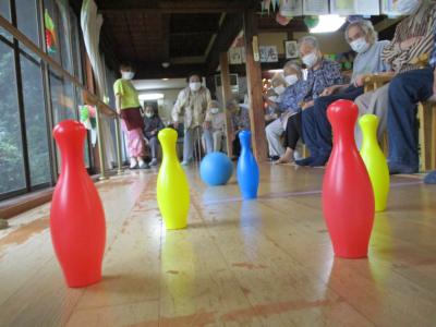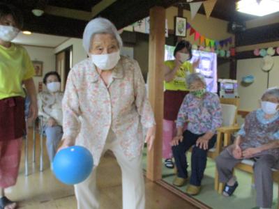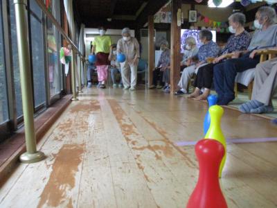 しっかりと立位を保ちながらピンを狙ってボールを投げ、楽しむ皆さんです。