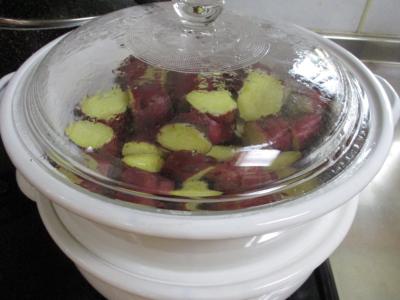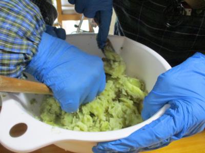 粗熱が取れましたら、温かい内にマッシャーで潰します。