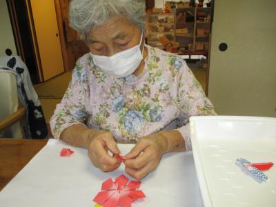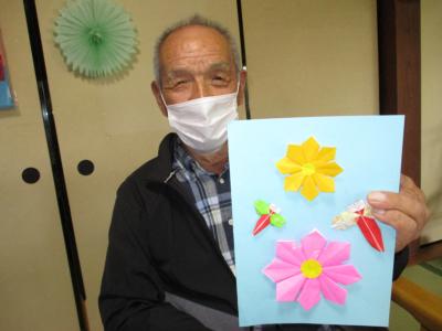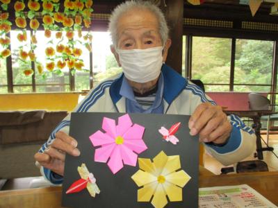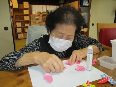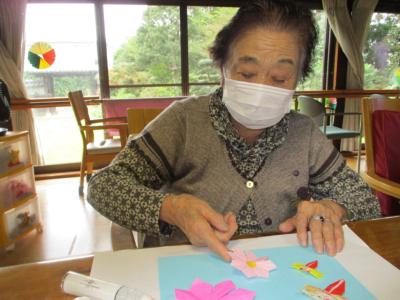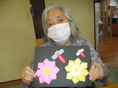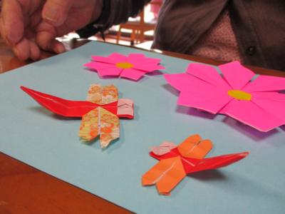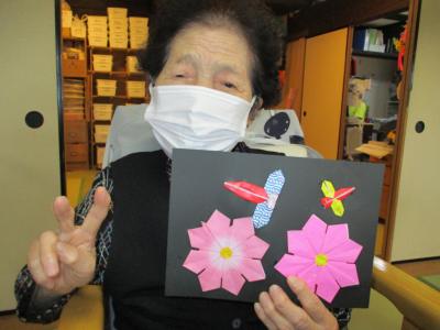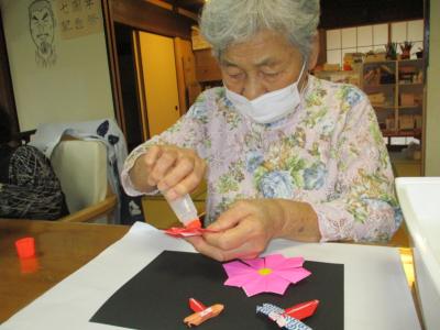 色画用紙に、折り紙で折ったコスモスやトンボを貼っていきます。