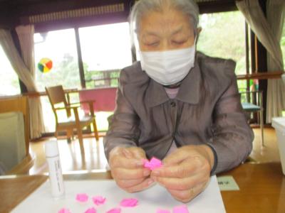 花びらの一つ一つを糊で繋ぎ合わせコスモスのお花に形を変えていく手作業で、