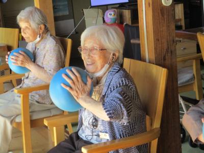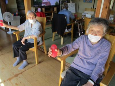 バランスボールやハンドグリップを使って皆さんで一緒に楽しく身体を動かしています